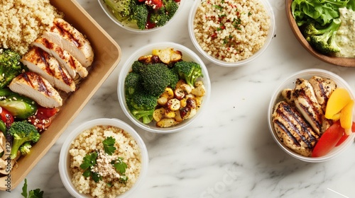 A flat lay of portion control containers filled with healthy food like quinoa, broccoli, and grilled chicken on a marble surface.