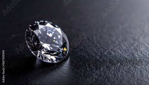 A flawless, round brilliant cut diamond rests on a dark, textured surface, gleaming with captivating light.
