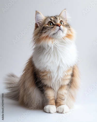 A fluffy cat with striking eyes gazing upwards against a light background.