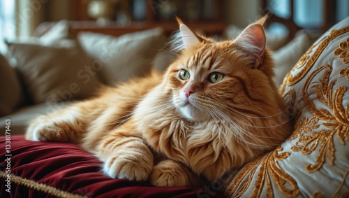 A fluffy ginger cat posed comfortably on a plush cushion.