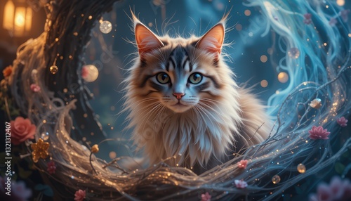 A Fluffy Kitten Poses in a Magical Forest Setting