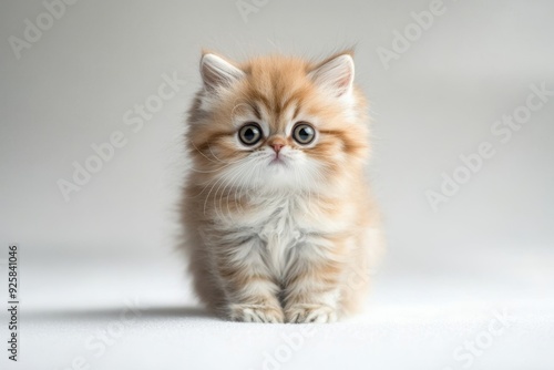A fluffy Persian kitten sits on a pristine white background, looking directly at the camera with large, expressive eyes, its cute and curious expression captured perfectly, with the simple background