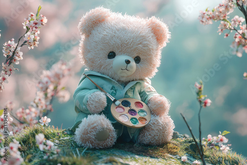 A fluffy teddy bear artist with a paint palette and brush sits among delicate cherry blossoms in a whimsical spring garden.