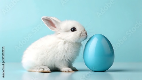 A Fluffy White Bunny Investigates A Pastel Blue Easter Egg Against A Serene Light Blue Background