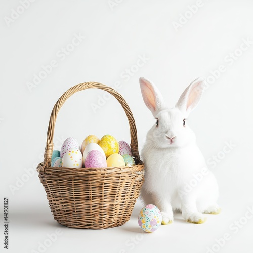 A fluffy white rabbit sits beside a woven basket overflowing with colorful, speckled Easter eggs against a clean white background