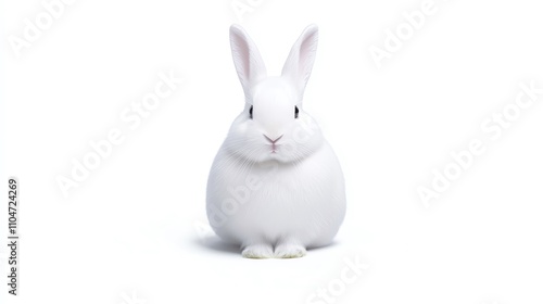 A fluffy white rabbit sits calmly against a plain background, showcasing its soft fur and adorable features.