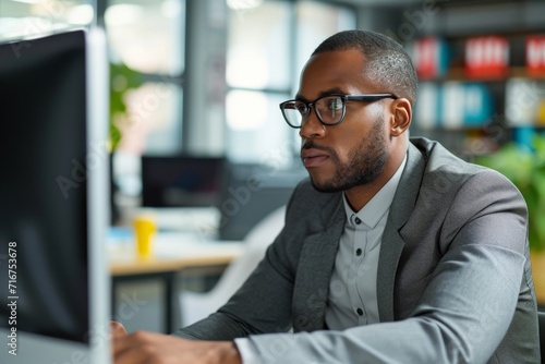 A focused businessman in a sharp suit, with glasses perched on his nose, intently stares at his computer screen in his office, diligently working on his job