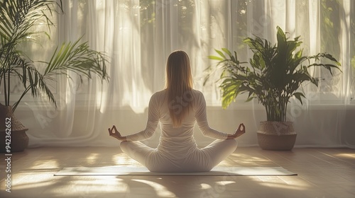 A focused girl in white clothes doing yoga on a mat indoors, with a calming and cozy space enhancing the serene experience