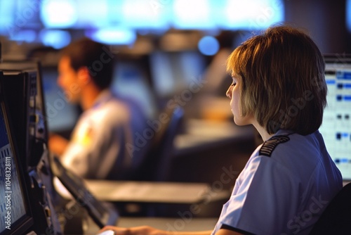 A focused individual works at a control center, monitoring screens with attention, highlighting a professional environment.
