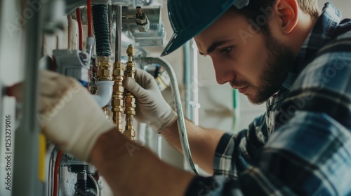 A focused shot of a plumber installing plumbing fixtures in a commercial office tower, Office tower plumbing installation scene, Plumbing craftsmanship style