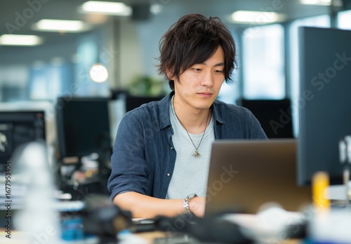 A focused young man working on a laptop in a modern office environment, surrounded by technology and a contemporary workspace.