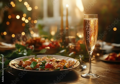 A Food Rustic celebration table with side dish with sparkling drink and champagne glass global popularity