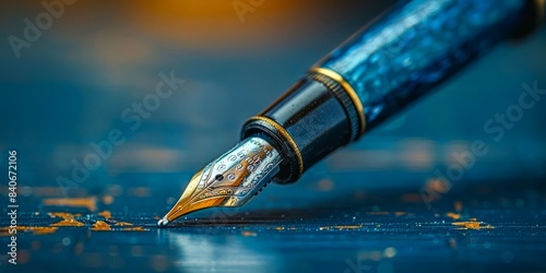 A fountain pen with blue and gold accents lays on a blue surface with a blurry background