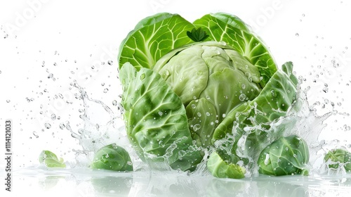 A fresh cabbage surrounded by splashes of water, emphasizing freshness and vitality.