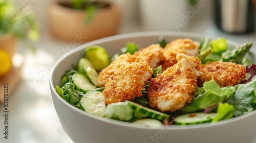 A fresh salad topped with crispy chicken, showcasing vibrant ingredients in a bowl.