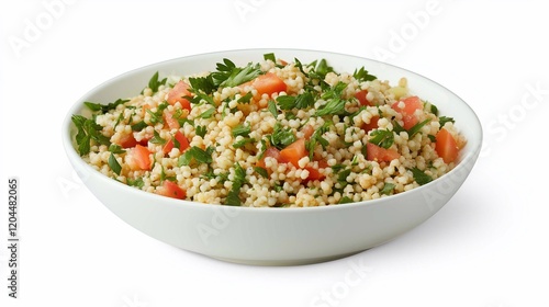 A fresh tabbouleh salad with finely chopped parsley, mint, tomatoes, and bulgur, served in a white bowl isolated on white background