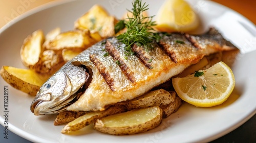 A fried fish fillet with potato chips, garnished with herbs and a wedge of lemon, served on a modern white plate