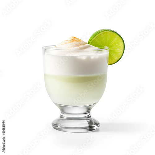 A frothy pisco sour cocktail in a rocks glass, isolated on a white background, created by Generative AI.