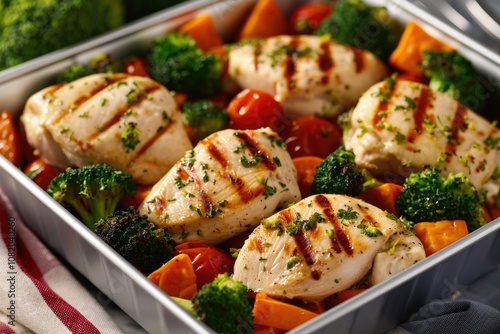 A full food pan filled with cooked chicken, steamed broccoli and carrots