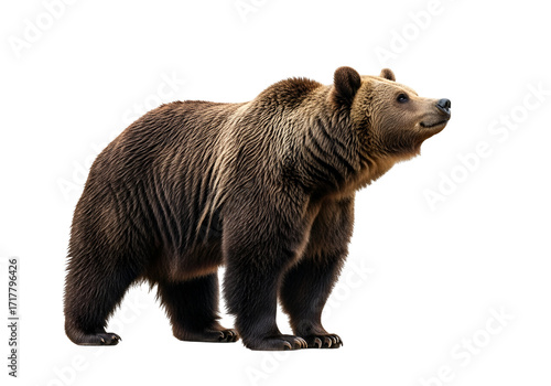 A full-bodied brown bear in profile view, showcasing rich fur details against a striking black background.