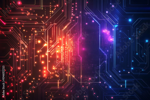 A futuristic circuit board design in festive New Year colors, featuring intricate digital technology elements, glowing lights, and advanced geometric patterns for a modern tech aesthetic.