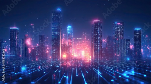 A futuristic city skyline with glowing lights and data streams at night in a digital world