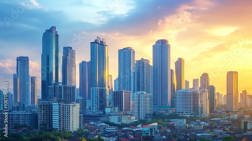 A futuristic city skyline with skyscrapers reaching towards a vibrant purple sky at dusk Vibrant futuristic city at sunset, colorful skyscrapers with sleek windows, modern design, dynamic illustration