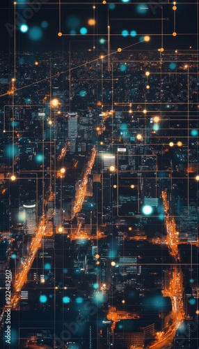 A futuristic cityscape at night, intersected by glowing lines, capturing the essence of a connected digital network.