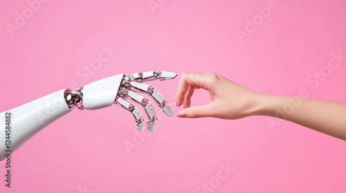 A futuristic concept featuring a human hand gently reaching towards a robotic hand, symbolizing the connection between humanity and technology, set against a vibrant pink background.