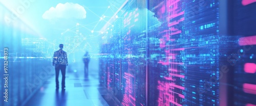 A futuristic data center with people amidst glowing servers and digital connections.