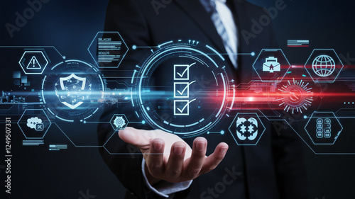 A futuristic digital interface with a hand holding a glowing checklist surrounded by high-tech symbols, warning signs, and global data, symbolizing innovation and cybersecurity.