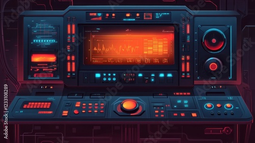 A futuristic industrial control panel with AI-powered analytics on a glowing orange background.