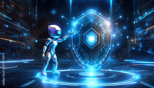 A futuristic robot interacts with a glowing shield, set in a high-tech digital environment filled with vibrant blue lights.