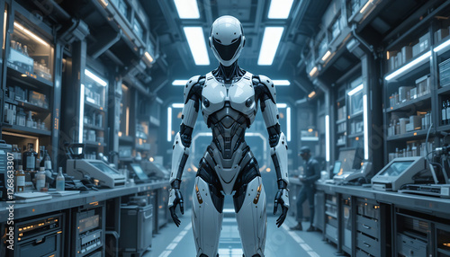 A Futuristic Robot Standing in a High-Tech Laboratory