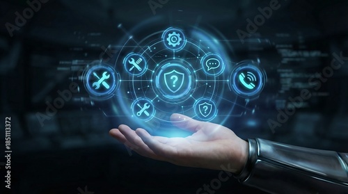 A futuristic scene depicting a person with a robotic arm holding glowing blue security icons, representing cutting-edge technology and innovation in cybersecurity and data protection.