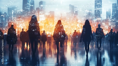 A futuristic virtual space filled with floating holographic devices, where people from various cultures interact, each device displaying cultural symbols,
