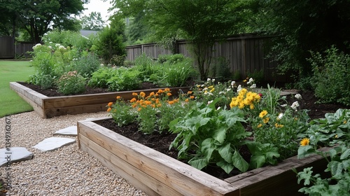 A garden with a stone path and a wooden fence. The garden is full of flowers and plants, including some orange flowers