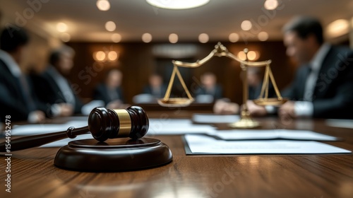 A gavel and scales of justice sit on a table in a courtroom or meeting room where blurred figures in suits discuss legal matters.