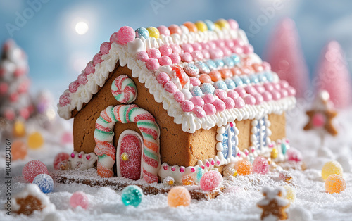 A gingerbread house with a red door and a candy cane on the roof. The house is decorated with colorful icing and candy