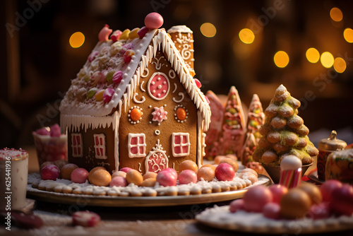A gingerbread house with candy and icing. Christmas Holidays background