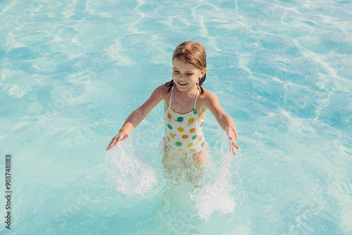A girl happily splashes around in the pool, enjoying a summer day. Perfect for advertising related to children's activities, family events, and summer products.