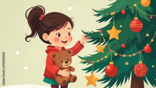 A girl stands in front of the Christmas tree and holds a bear in her hands. Christmas card.