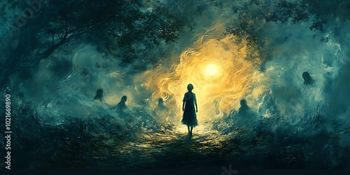 A girl walks a path in a dark forest towards a mystical glow