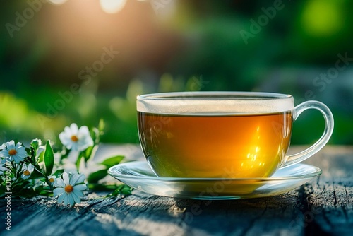 A glass cup filled with warm tea sits on a wooden table outdoors. Delicate flowers surround the cup while the soft glow of sunset enhances the tranquil atmosphere
