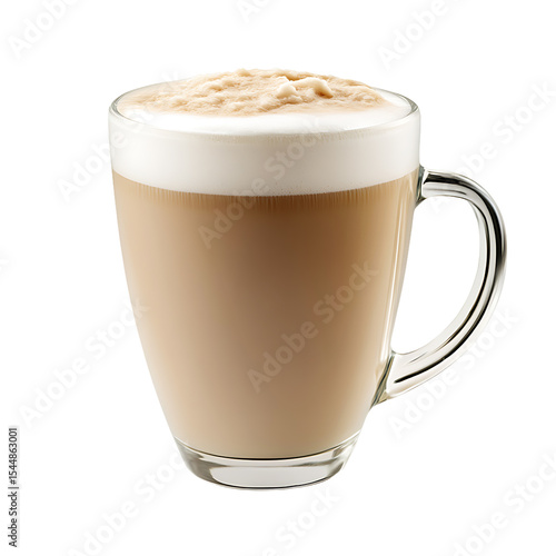 A glass mug filled with a creamy latte topped with frothy milk foam