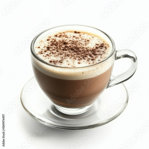 A glass of frothy cappuccino, isolated on a white background, emphasizing a classic coffee drink