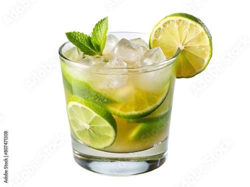 A glass of ice water with lime and mint leaves