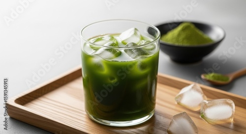 A glass of iced matcha green tea on a wooden tray with ice cubes and a bowl of matcha powder.