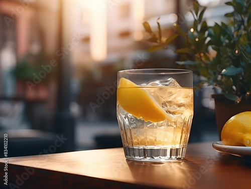 A Glass of lemon juice with green and yellow lemon, Refreshing and healthy lemon juice ice in a glass with summer background, lemon juice photo