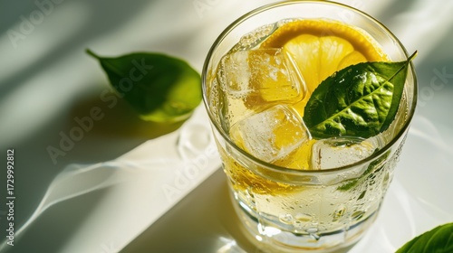a glass of lemon water with green tea leaves and ice cubes, close-up shot on a white background, product photography, high resolution, professional color grading, soft shadows